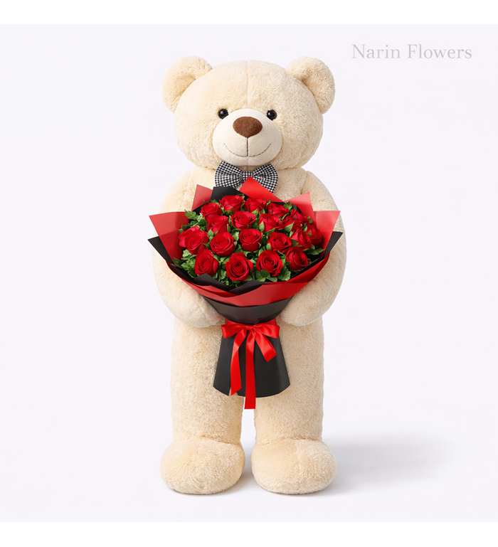 1.70 cm boyunda dev peluş ayıcık, kucağında özenle hazırlanmış 20 adet taze kırmızı gül ile birlikte teslim edilir.
